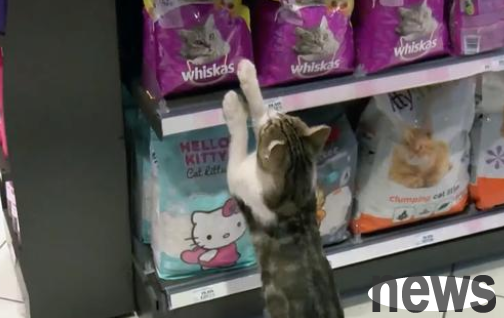 The cat walks to the shelf very naturally, stands on both feet, and skillfully pulls the cat food on it with his paws. While pulling, he meows imploringly, as if to say: Good Samaritan, I am so hungry, can you buy me some food?