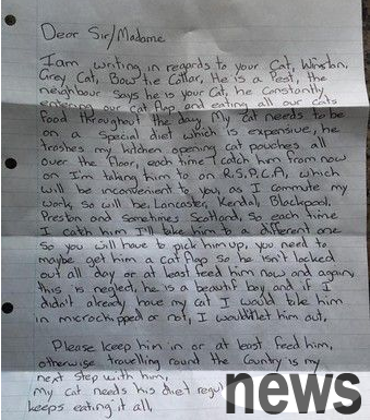 Hart’s cat is named Winston. He is curious and playful by nature. He often disappears during the day. Karl never paid attention to it until one day he found an unsigned note outside his home that read "Your cat" This cat is a big bad guy. It ran into my house from the cats and ate up all my expensive feed, causing my cat to starve. From now on, if I catch it again, I will send it to the shelter! Please let your cat stay at home!"