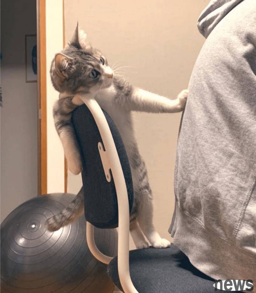 The cat doesn’t want its owner to sit on the newly bought chair. The expression on its face when it pushes the owner is so funny that it’s going to become a sperm.