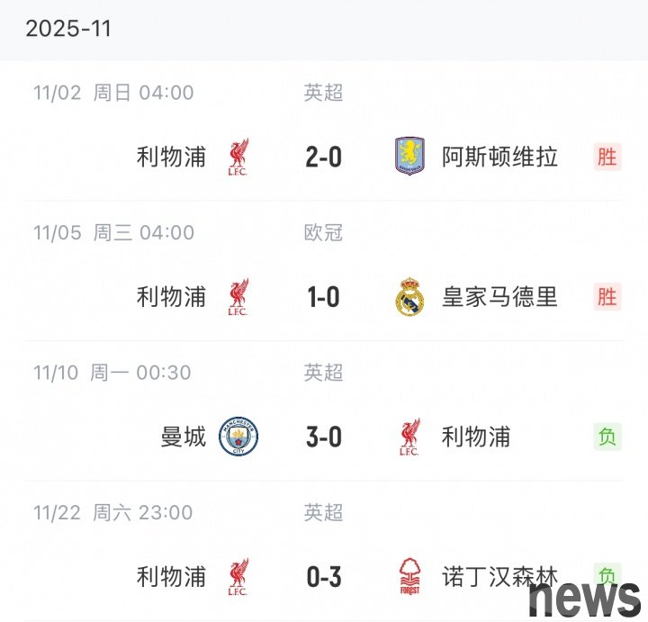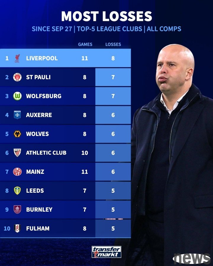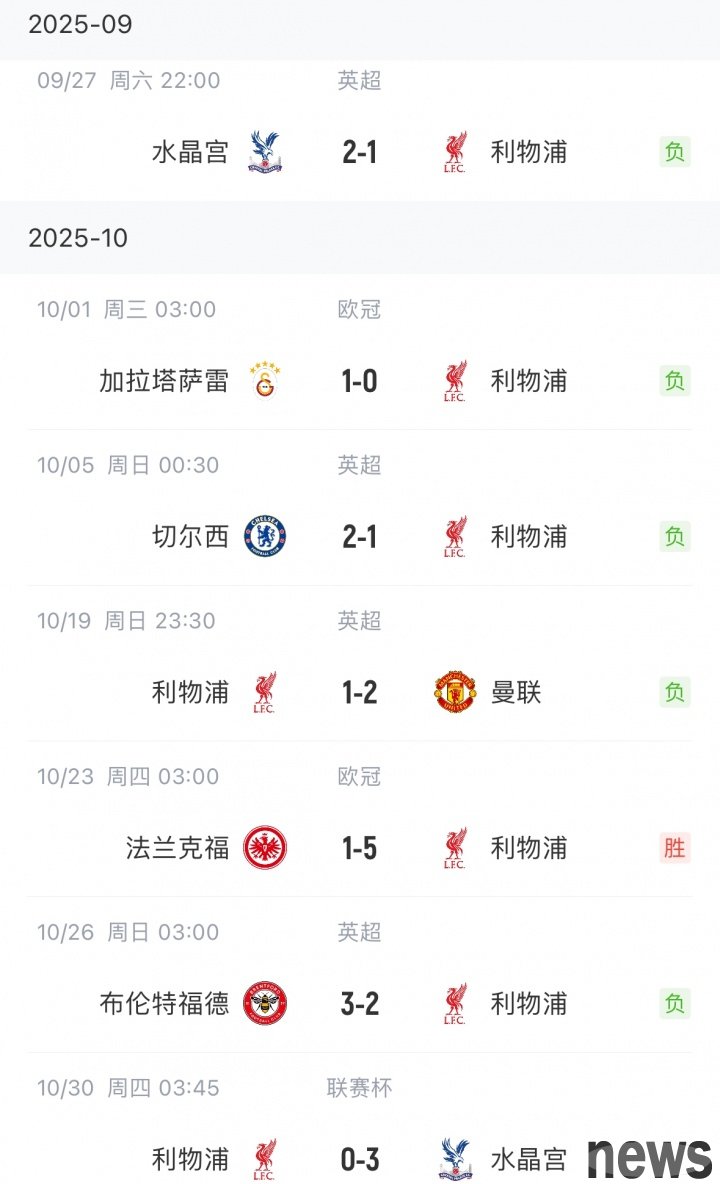 Dezhuan has compiled a list of losses among the five major league teams since September 27. Liverpool ranks first on the list with 8 games.