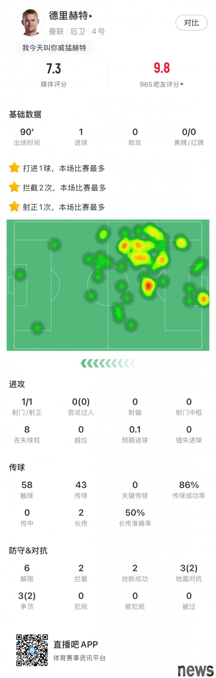 In the 11th round of the Premier League, Manchester United tied Tottenham 2-2 away from home. De Ligt scored with a header in the stoppage time countdown, helping the team take away 1 point from the away game.