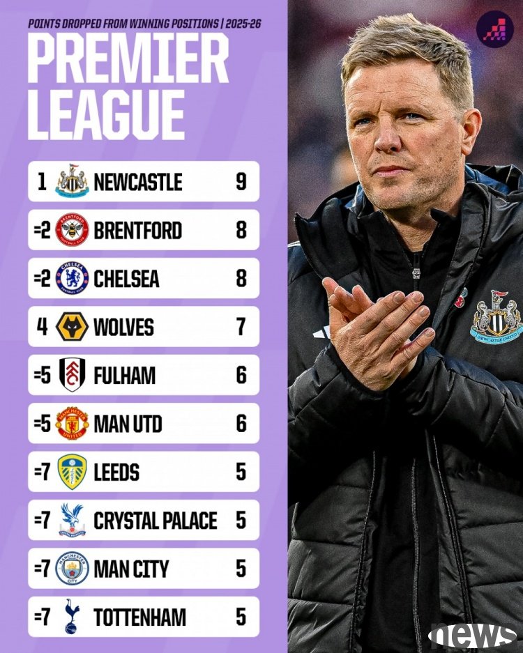 Opta counted the points lost by Premier League teams after taking the lead this season and listed the list. Newcastle has the most points with 9 points, followed by Brentford and Chelsea with 8 points.