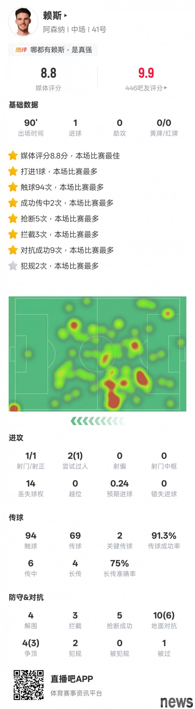 In the 10th round of the 2025-26 Premier League season, Arsenal 2-0 Burnley away. Rice started the game and scored 1 goal with 1 shot and 1 on target. In addition, he also made 2 key passes, 4 clearances, 3 interceptions and 5 steals, with a game-high rating of 8.8.