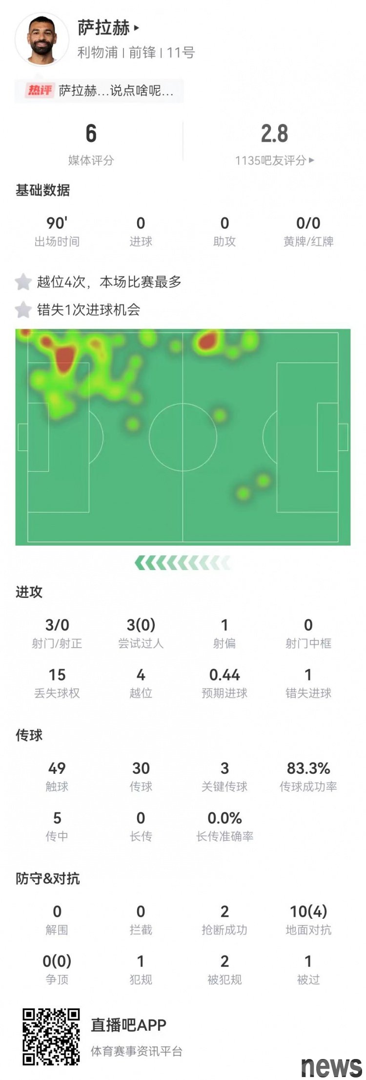 Liverpool lost 0-3 to Manchester City in this round of the Premier League. Salah's statistics for this game are as follows:
