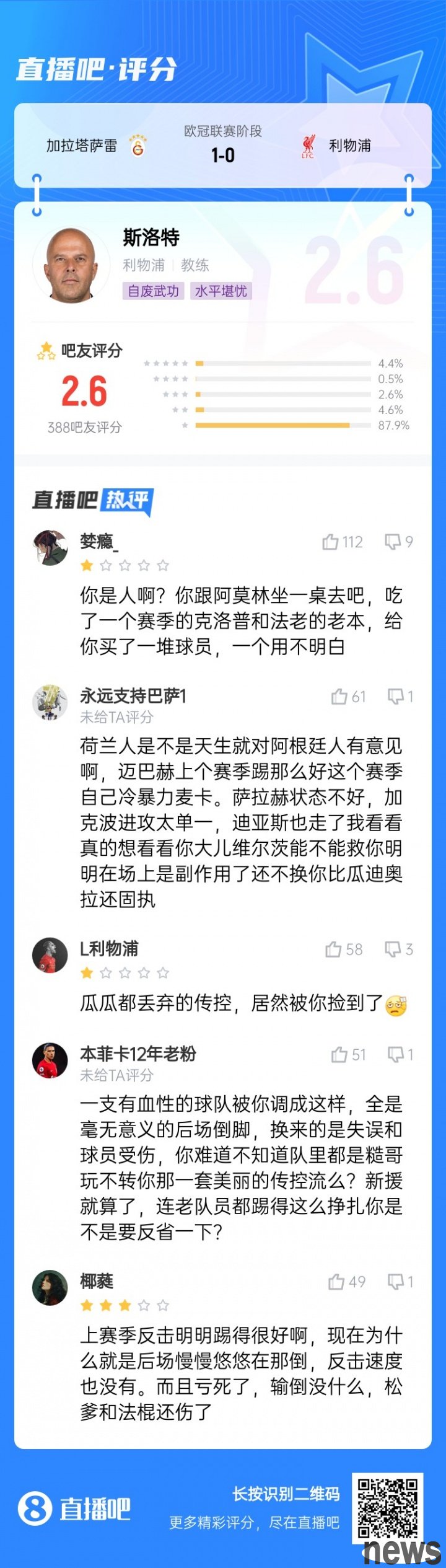10:50am, 1 October 2025 In the second round of the Champions League stage in the early morning, Liverpool lost 0-1 to Galatasaray away, suffering two consecutive losses in all competitions. This season, Liverpool coach Slot's reputation has been greatly reversed, and his tactical arrangements have been criticized, and the incompatibility of new players Wilz and Isaac has pushed him to the forefront.
