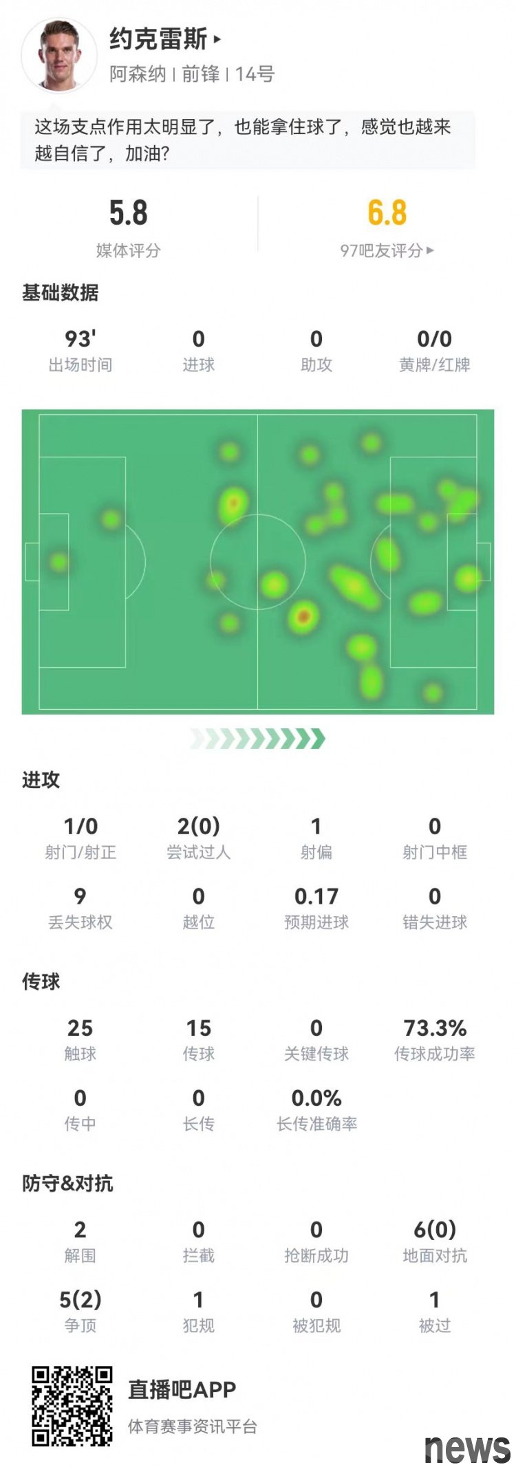 Arsenal defeated Crystal Palace 1-0 in this round of Premier League focus match. Jocles's statistics for this game are as follows:
