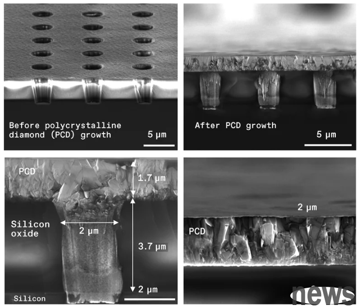 {twenty one} ▲ The boundary between diamond and semiconductor forms a thin layer of silicon carbide, which acts as a bridge for heat to flow into the diamond.In order to enable low-temperature growth, the team found a key chemical formula. Adding oxygen to the traditional methane and hydrogen mixture helps to continuously etch non-diamond carbon deposits. After extensive experiments, we found a formula that can grow large-grain polycrystalline diamond coatings below 400°C. This temperature is still within the tolerable range for CMOS circuits and other components.