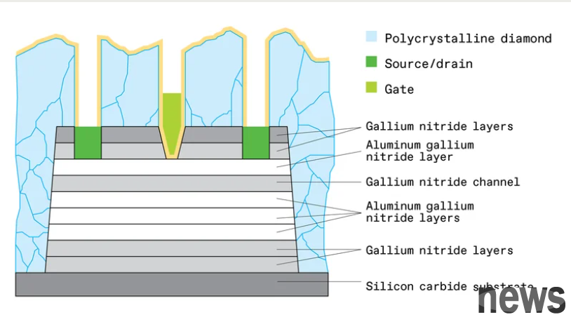 ▲ Gallium nitride high electron mobility transistors are an ideal test case for diamond cooling.